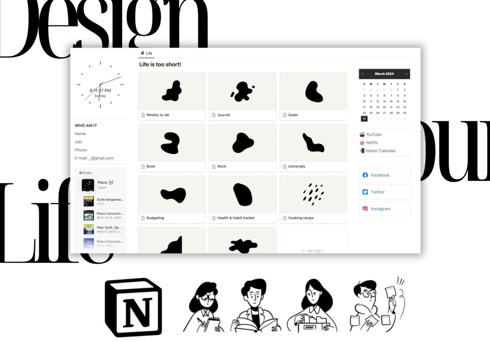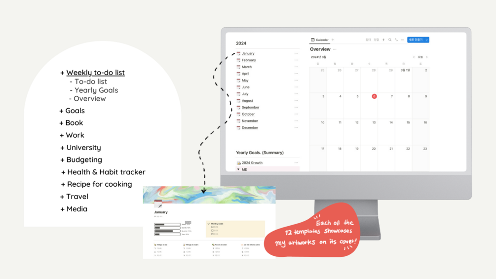 Hi, My name is Jenny Kim! I am delighted to introduce my templates to you guys. I have designed these templates to be user-friendly, comfortable, useful, and visually appealing. Also, most of the pictures and photos uploaded here are ones I've created :) I sincerely hope you all enjoy using them. Have a wonderful time using Notion!